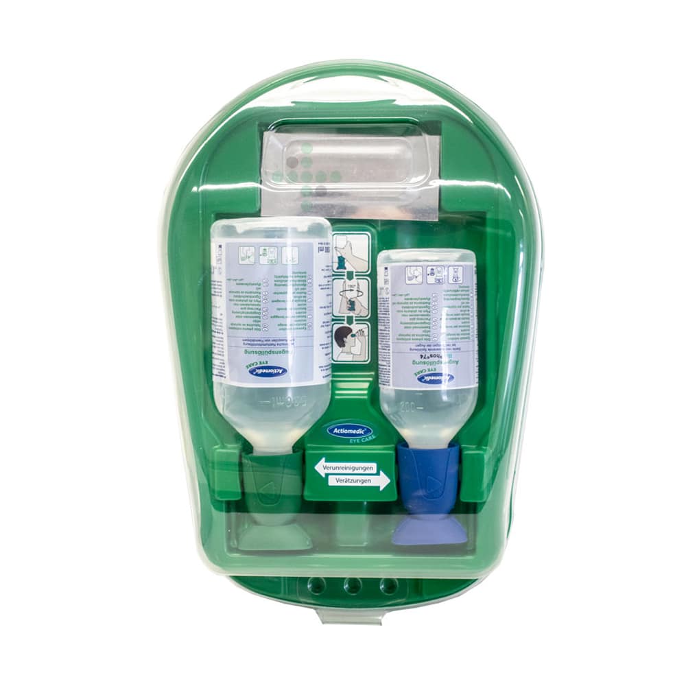 Dozownik do przemywania oczu – szybka pomoc dla podrażnionych oczu, łatwy w użyciu. Stacja do przemywania oczu z przezroczystą pokrywą i dwiema butelkami, idealna do montażu na ścianie , butelki gotowe do natychmiastowego użycia. Ergonomiczna nasadka z lusterkiem i piktogramem ułatwia obsługę, jest pyłoszczelna i zajmuje niewiele miejsca.