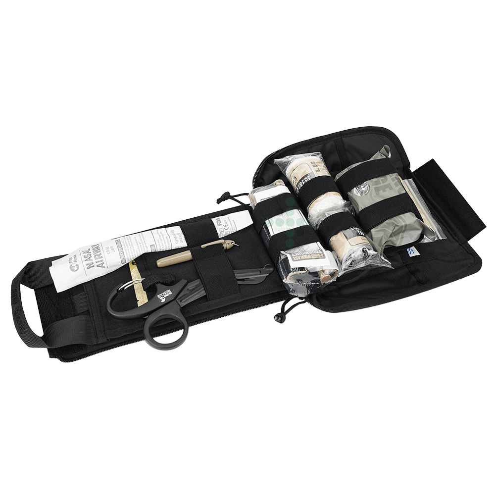 Kompletna taktyczna apteczka pierwszej pomocy.