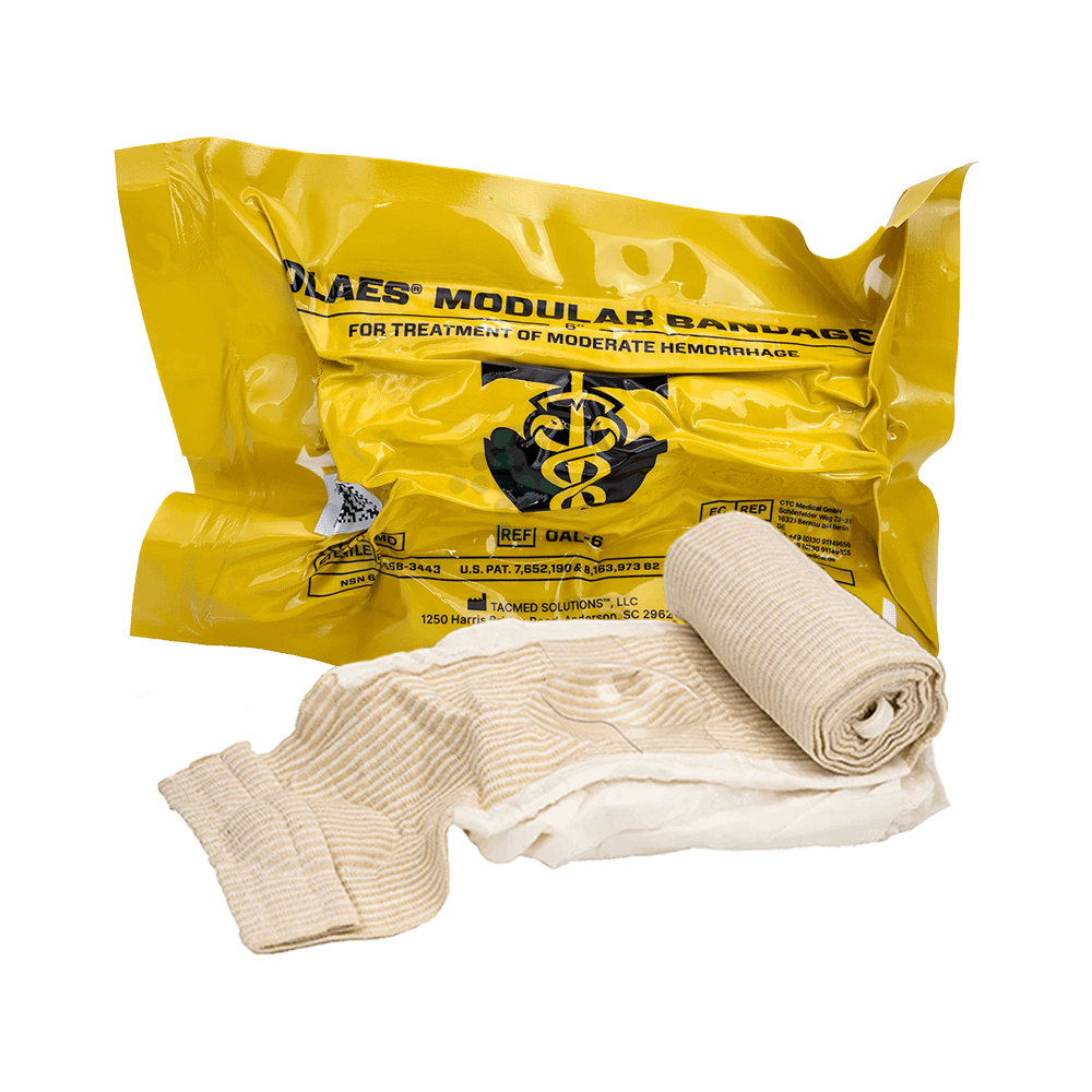 OLAES Modular Bandage 6″ to wszechstronny bandaż uciskowy/urazowy zaprojektowany jako uniwersalny „System pierwszej pomocy „4 w 1”. Opatrunek wykorzystuje elastyczny bandaż z paskami na rzepy, aby zapobiec samoczynnemu rozwijaniu się. Ułatwia to obsługę, szczególnie w sytuacjach stresowych lub gdy bandaż musi zostać szybko założony.