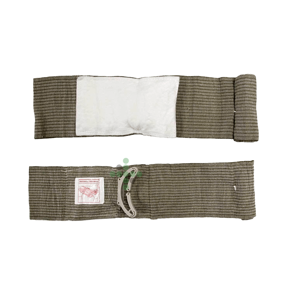 Bandaż izraelski 4″ z jest wyposażony w poduszkę 10 x 18 cm i podkładkę przesuwną na bandażu elastycznym.