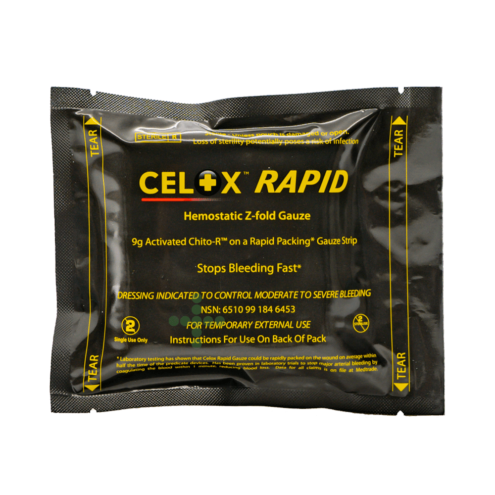 Celox Rapid Z-Fold Gauze to najszybszy środek tamujący krwawienie, który zatrzymuje krwawienie w ciągu 1 minuty. Gaza hemostatyczna CELOX Rapid oszczędza cenny czas w nagłych wypadkach i zmniejsza utratę krwi. Niezależne testy in vivo wykazały 100% skuteczność w osiąganiu hemostazy i zmniejszeniu utraty krwi w porównaniu z innymi metodami leczenia CELOX. CELOX Rapid tworzy żel adhezyjny, który uszczelnia ranę. Produkt został również przetestowany w modelu ewakuacji poszkodowanych, osiągając 100% wskaźnik powodzenia transportu bez ponownego krwawienia. CELOX Rapid jest dostępny w kompaktowym formacie z-fold dla łatwości użycia i przenoszenia.