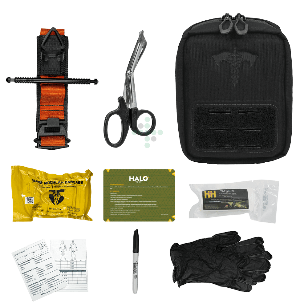 Kompletna taktyczna apteczka pierwszej pomocy.