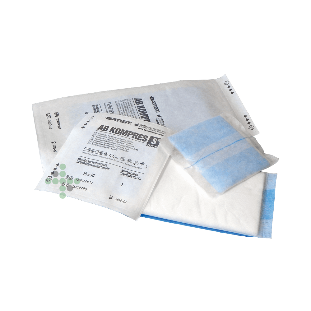 Kompresy chłonne o wysokiej chłonności z rdzeniem z rozdrobnionej celulozy i powierzchnią z włókniny w rozmiarach od 10 x 10 cm do 20 x 40 cm.
