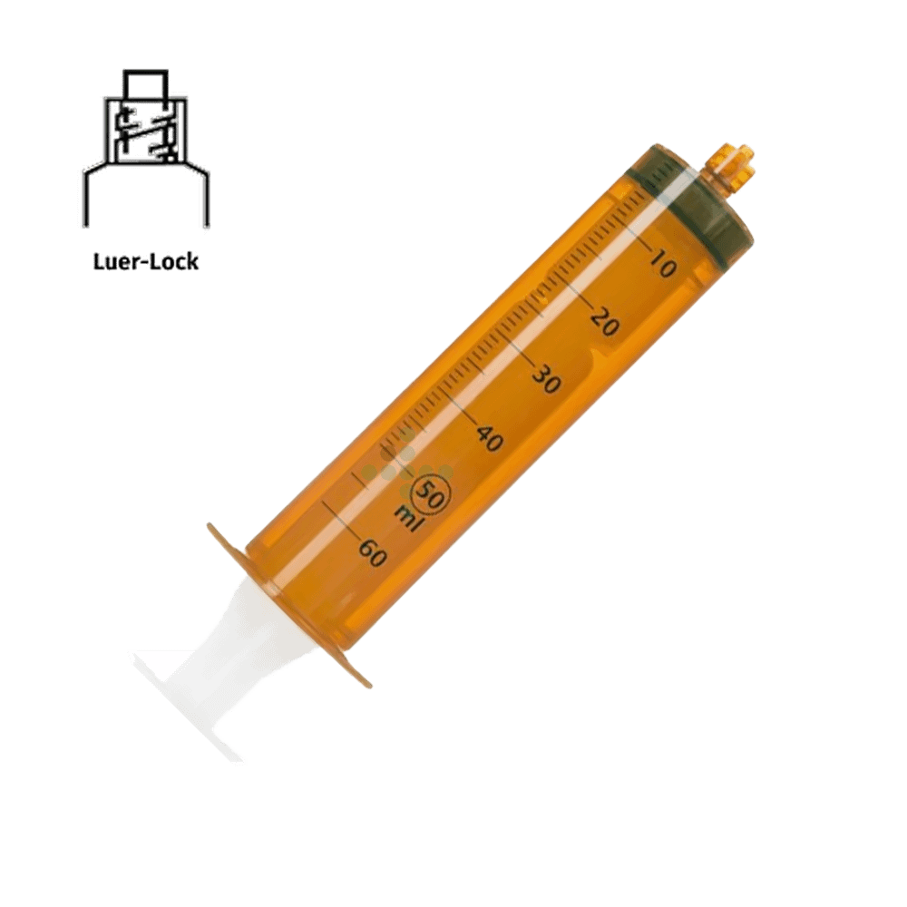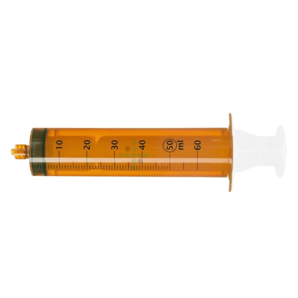 Strzykawka Margomed światłoczuła - 50 ml. Do jednorazowego użytku. TJednoczęściowa strzykawka ze złączem Luer Lock zapewniającym stabilność igły. Ta trzyczęściowa strzykawka z cewnikiem ma dużą pojemność. Jest przeznaczony głównie do podawania leków światłoczułych, ponieważ blokuje do 90% promieniowania UV o długości fali od 290 do 450 nm. Podwójne uszczelnienie tłoka zapewnia płynny ruch tłoka. Gumowy tłok zapobiega wyciekom płynu.