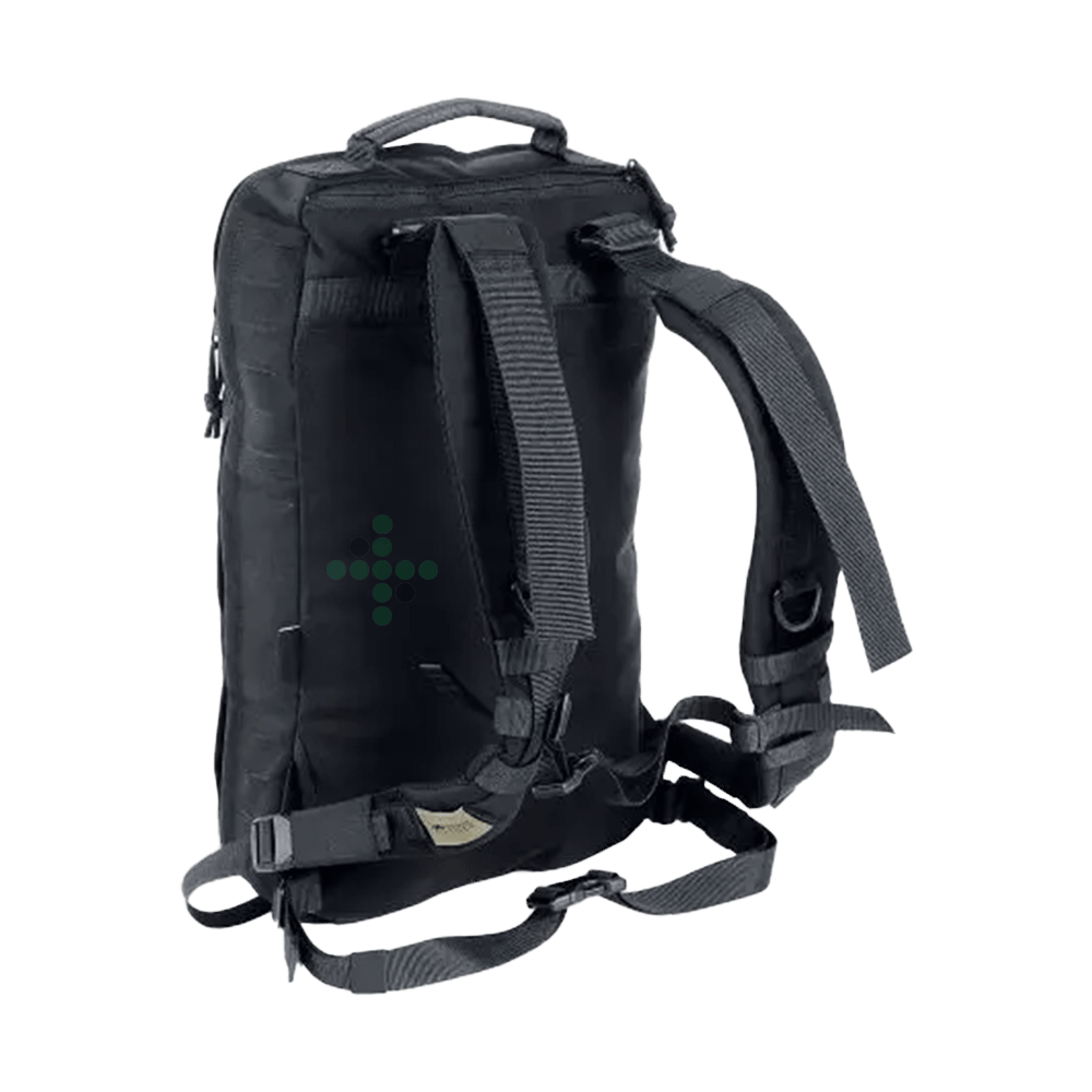 Mały, płaski plecak medyczny z eleganckim i przejrzystym układem wewnętrznym.