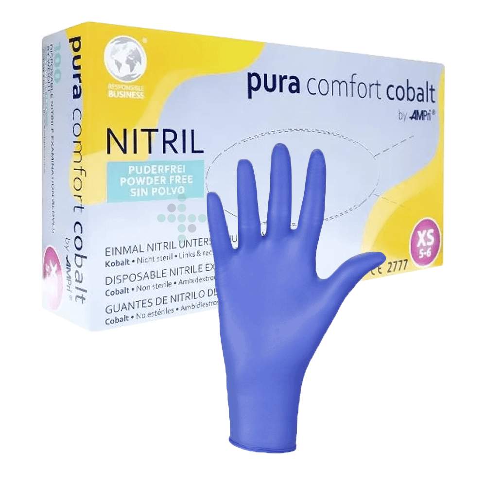 Rękawice nitrylowe bezpudrowe PURA COMFORT COBALT to ochronne rękawice nitrylowe – podstawowe nitrylowe rękawice chirurgiczne marki Puracomfort. Nitrylowe rękawice do badań nadają się do użytku w administracji, edukacji, stomatologii, przemyśle, usługach kosmetycznych, szpitalach, gastronomii i innych zastosowaniach medycznych. Są idealne do gabinetów dentystycznych i weterynaryjnych, laboratoriów, salonów kosmetycznych i fryzjerskich lub do użytku domowego. Zatwierdzony do kontaktu z żywnością.