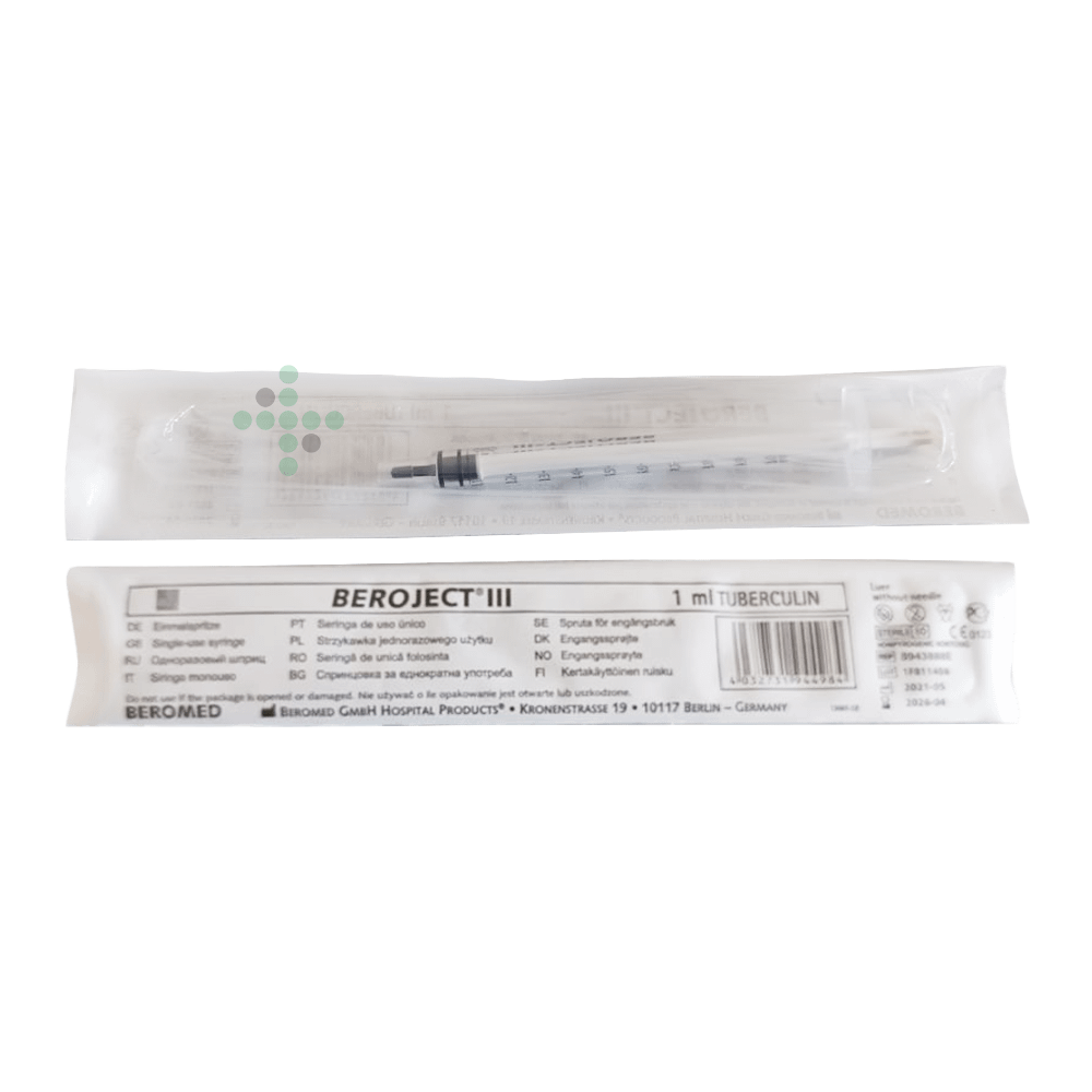 Strzykawka tuberkulinowa BEROJECT 1ml – 100 szt. Jednorazowa 3-częściowa strzykawka tuberkulinowa. Pojemność 1 ml. Strzykawka posiada wyraźną i stałą skalę z dokładnością do 1 ml.