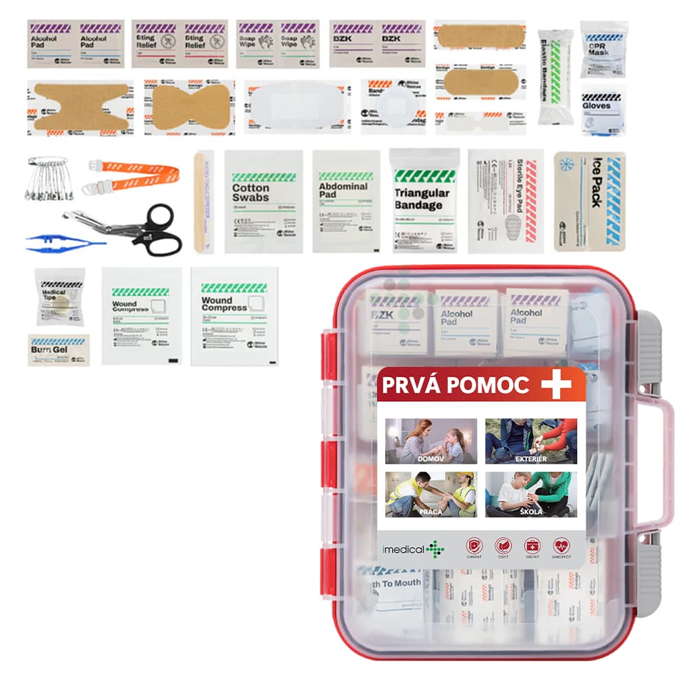 Uniwersalna apteczka pierwszej pomocy (dla 100 osób) zawiera ponad 350 materiałów medycznych, w tym bandaże o różnych rozmiarach, sterylne opatrunki, żele na oparzenia, kompresy chłodzące i chusteczki antyseptyczne, które spełniają międzynarodowe standardy medyczne w zakresie kompleksowego leczenia ran szarpanych, otarć, skręceń i oparzeń.